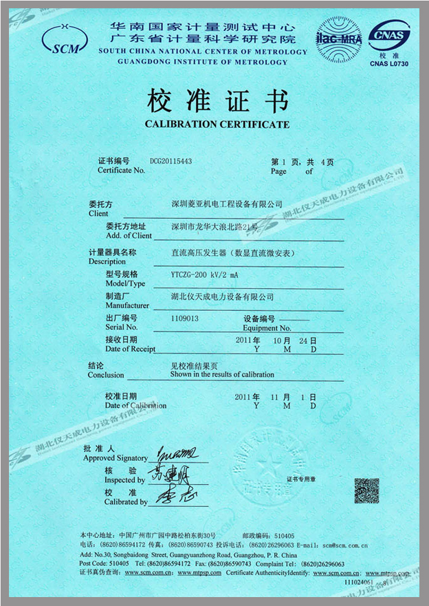 轉載:"YTCZG-200kV/2mA直流高壓發生器鑒定證書" 請注明來源于儀天成電力。 更多技術問題請致電儀天成電力客戶服務:027-87876585,技術部專線:027-87876585,在線客服:719388481